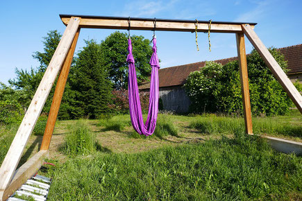 Die Gerüsthöhe wurde angepaßt, sodaß neben Entspannung im Tuch, Gleichgewichts- und Dehnungsübungen sowie Kräftigung auch akrobatische Tricks möglich sind.